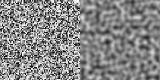 | 각 픽셀이 완전히 랜덤한 값으로 생성. | 인접한 좌표끼리 값이 부드럽게 변화. |