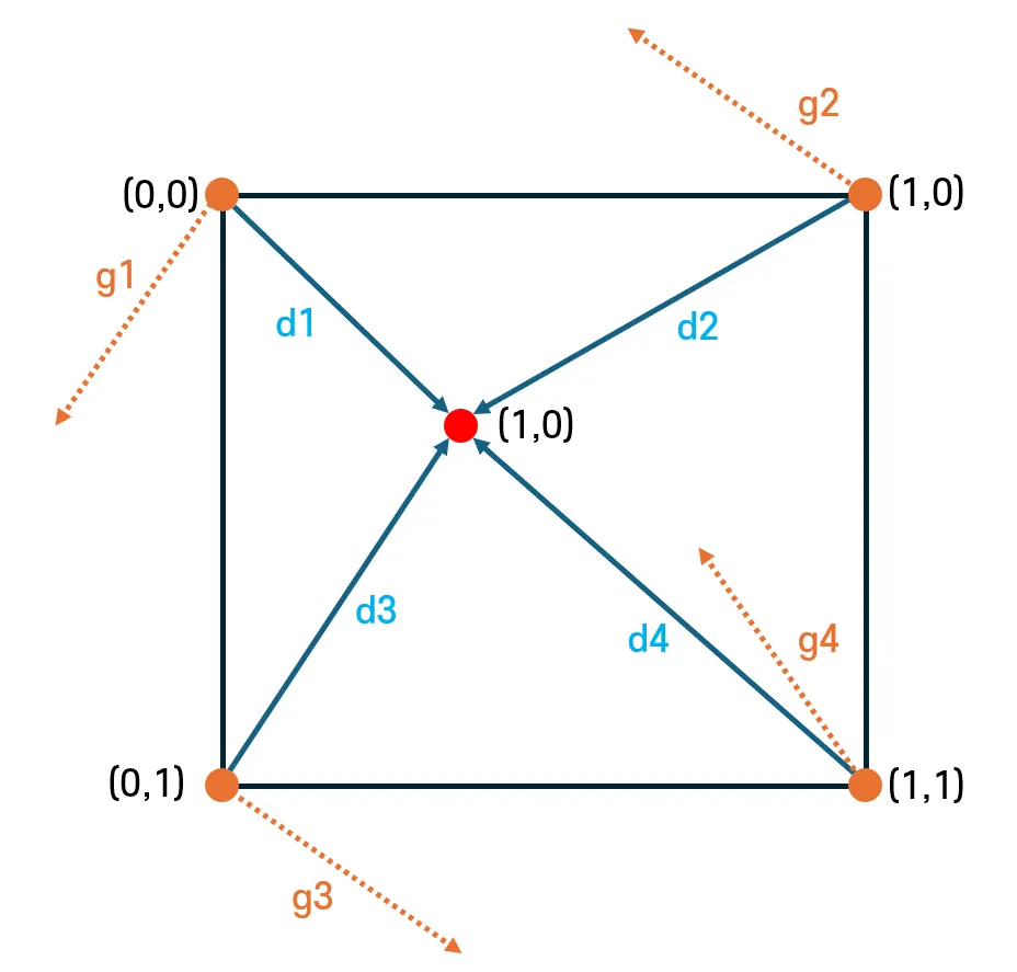 인접한 정수 격자 셀의 각 꼭짓점에서, “입력 위치까지 향하는 벡터(오프셋 벡터)”를 구하고, 해당 격자점에 저장된 방향 벡터와 내적$(g_n \cdot d_n)$한다.