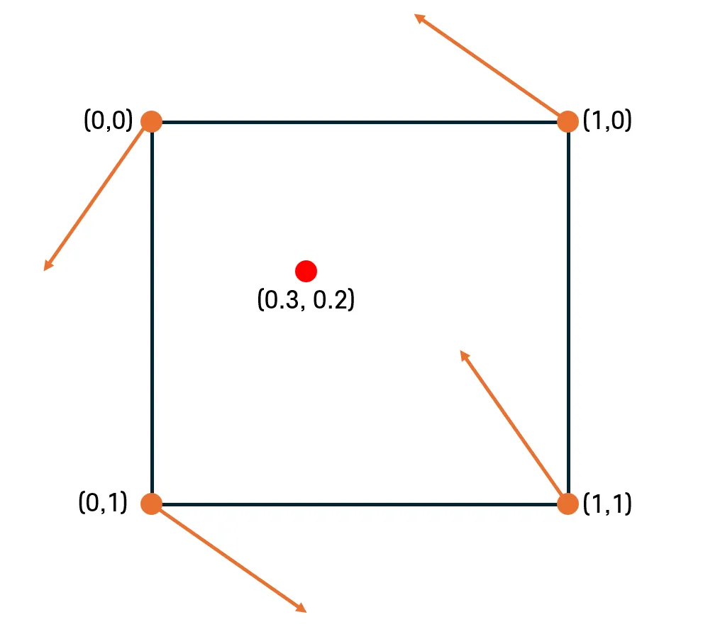 Perlin Noise 함수는 각 격자의 꼭짓점마다 랜덤한 방향벡터(Value Noise에서는 스칼라 값)를 저장하고, 이 벡터와 입력 좌표 간의 관계를 이용해 의사 난수 값을 생성한다.