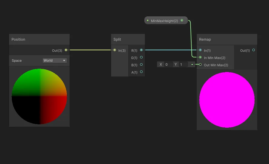 먼저 터레인의 Y좌표(높이)를 얻기 위해 Split노드를 사용해 Position에서 Y 성분만 분리한다.