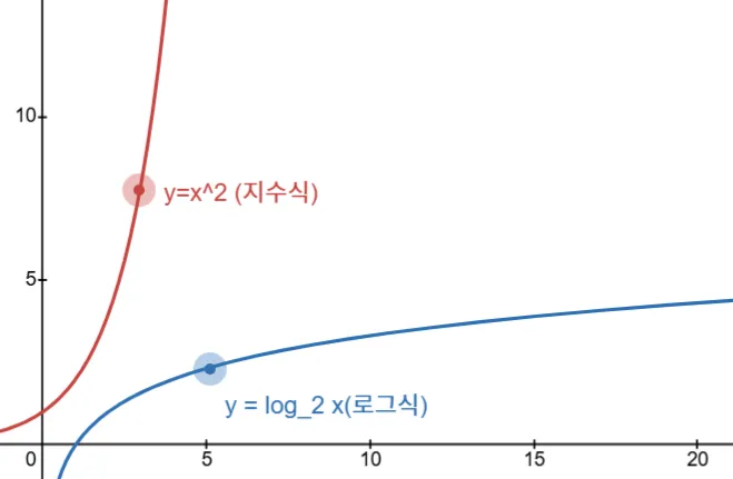 - 위처럼, 지수식과 로그식은 극단적으로 다른 성장 속도를 가진다.