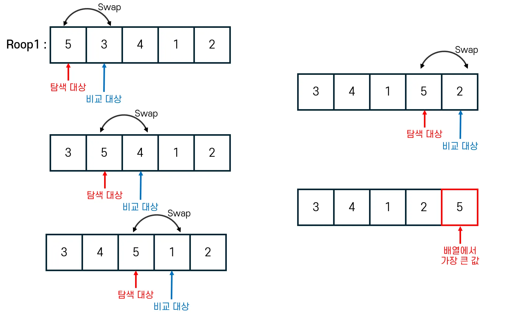 이중 for문을 사용해서 구현하며, 가장 바깥쪽 반복문이 한 번 수행될 때마다 가장 큰 값이 배열의 끝으로 이동하게 된다.