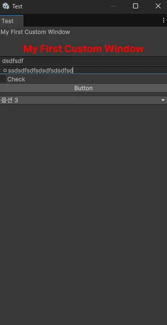 Init()에서 호출하는 GetWindow<CustomWindowTest>()로 해당 타입의 창을 가져오거나 없으면 새로 생성한다.