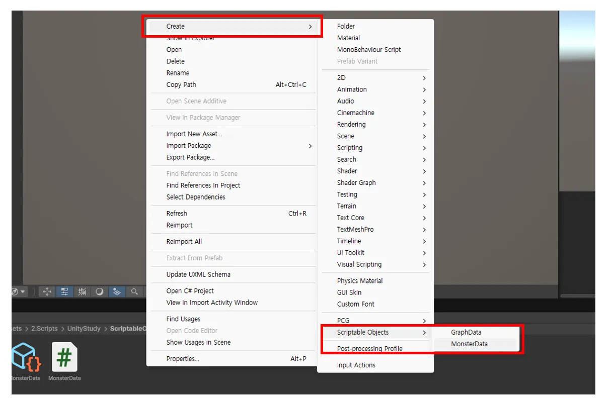 프로젝트 창에서 에셋 파일(.asset)을 생성하기 위해 [CreateAssetMenu] 어트리뷰트를 사용한다.