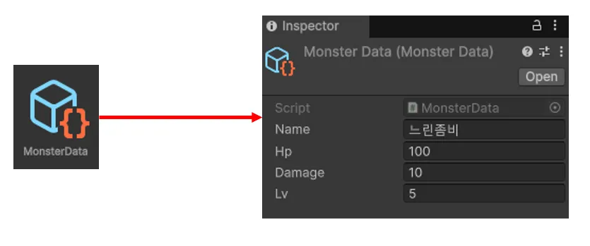 MonsterData.asset 처럼 하나의 스크립터블 인스턴스를 여러 오브젝트가 공유하면, 해당 .asset의 값을 변경했을 때 모든 참조 대상에게도 즉시 반영된다.