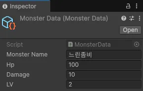 스크립터블 오브젝트를 사용하려면, 해당 컴포넌트에서 스크립터블 오브젝트 클래스 타입의 변수를 선언한 후, 인스펙터에서 .asset 파일을 드래그하여 연결하면 된다.
