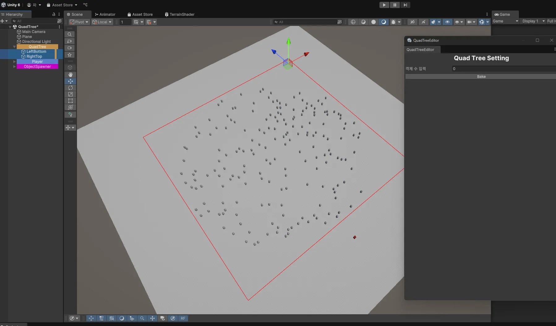 - 노드 안에 포함될 최대 객체 수를 설정하고 Bake 버튼을 누르면 공간 분할을 실행하도록 구현하였다.