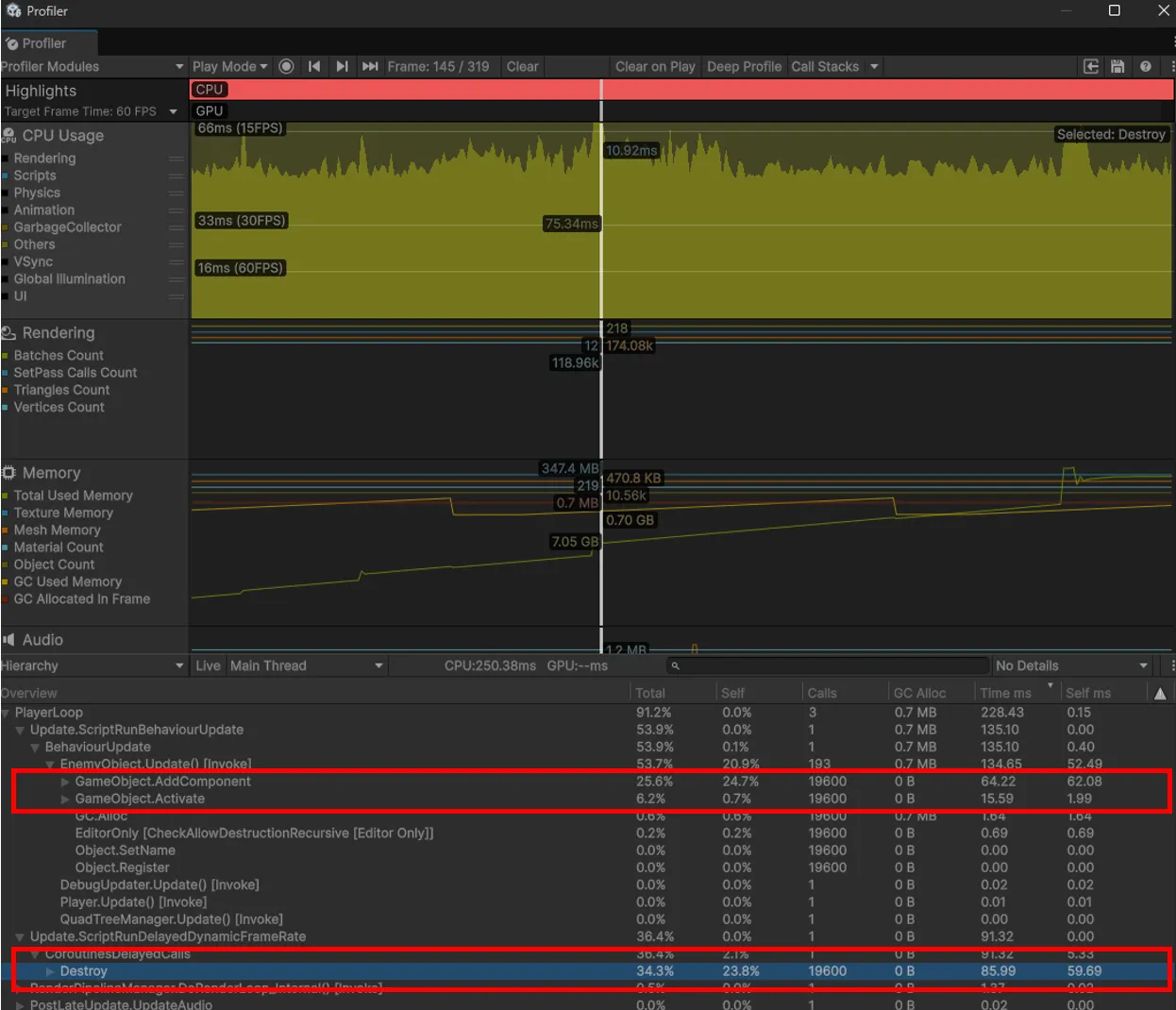 | 주요 비용 | Destroy() - 36.4% / 호출 수 : 19,600 AddComponent - 25.6% |