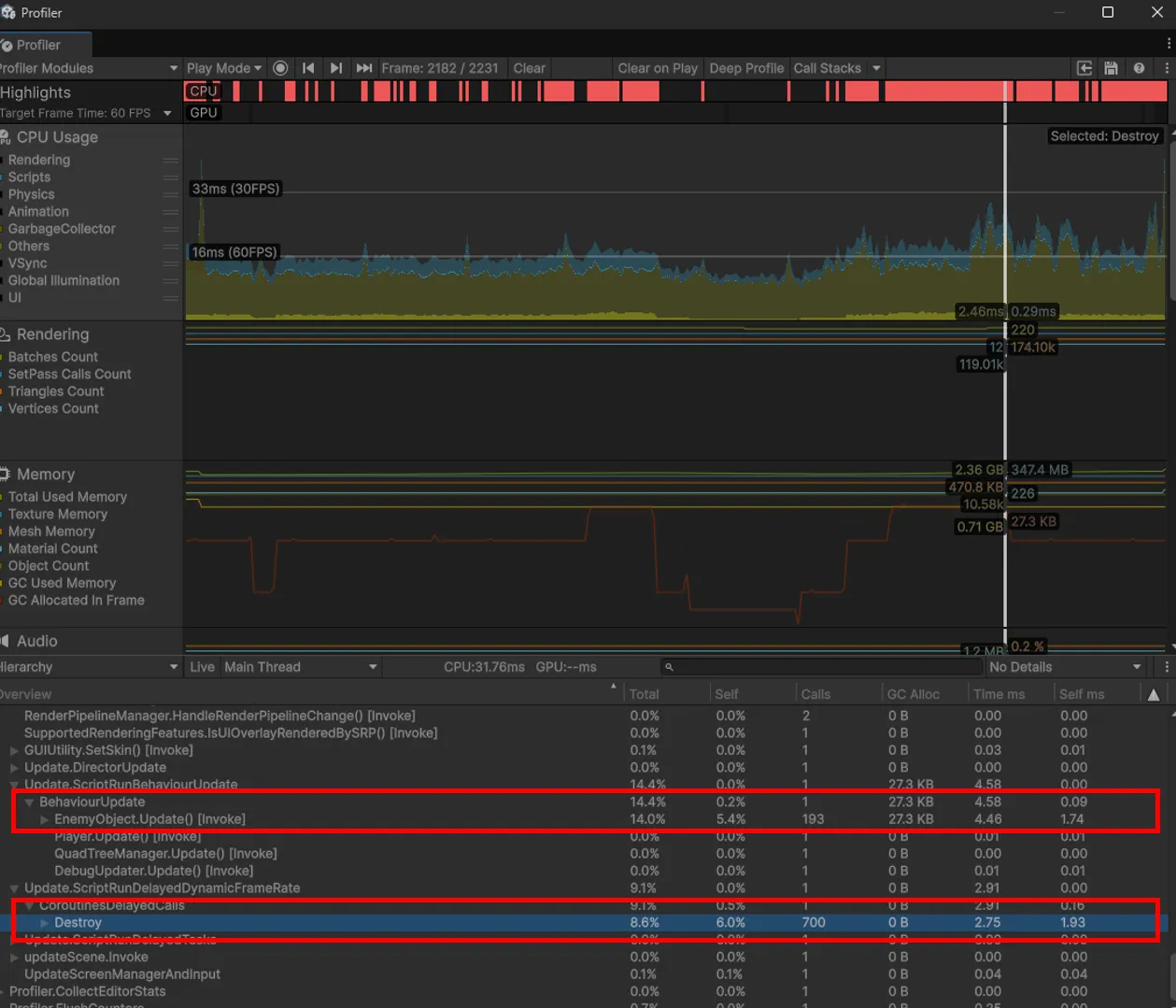 공간분할 적용으로 활성화 객체가 전체 → 일부 객체로 줄어들어 개별 객체의 생성/파괴 및 활성화 반복이 줄었고, Destroy()와 AddComponent 같은 함수의 비중이 크게 완화되었다.