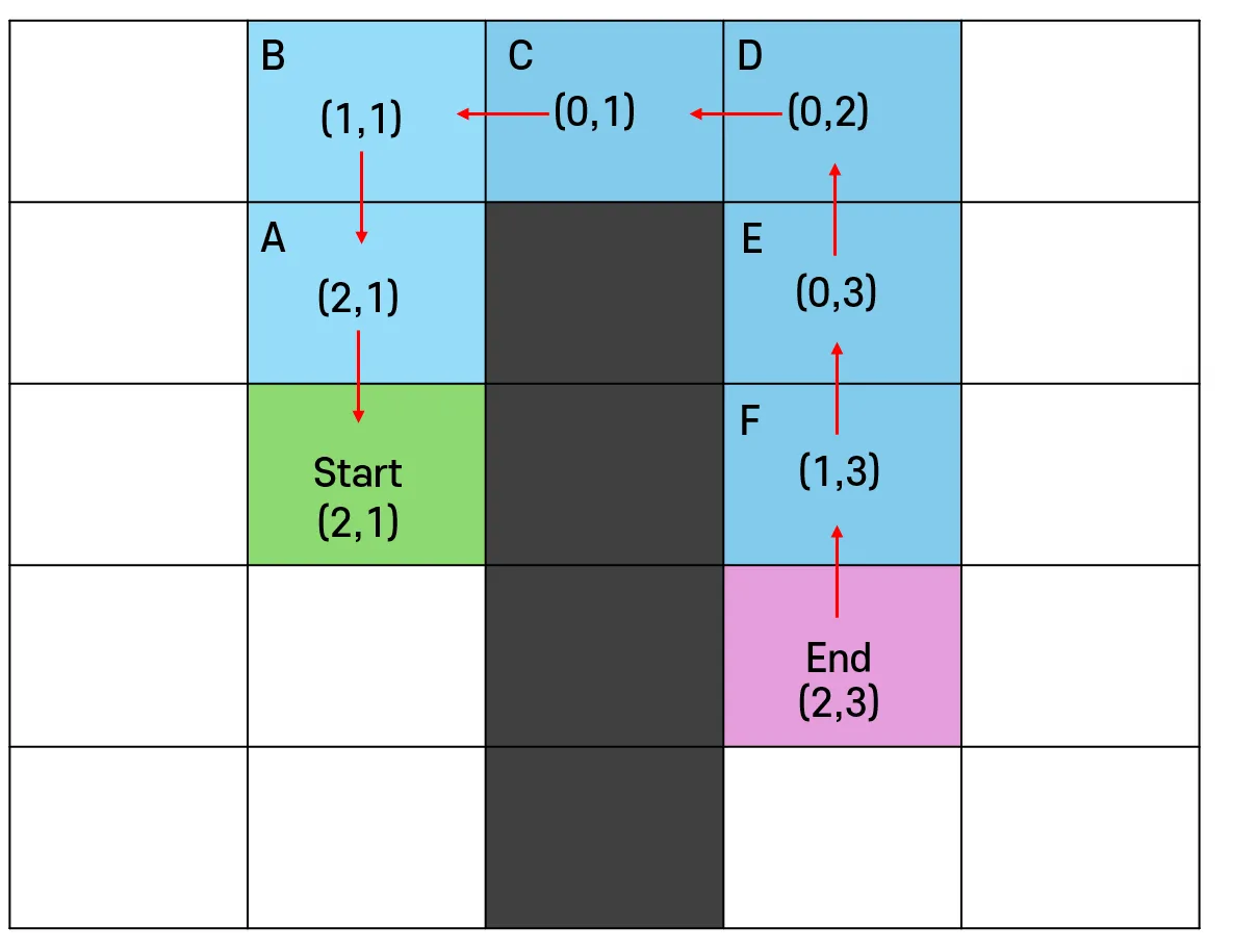 - 노드 A(1,1)는 Start노드로부터 탐색되었기 때문에, A노드에는 Start노드의 위치(2,1)를 기록한다.