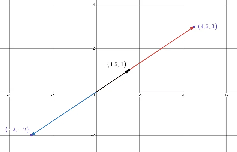 스칼라 곱셈으로 생성된 벡터는 원점을 지나고, 벡터와 평행한 직선상에 위치한다.