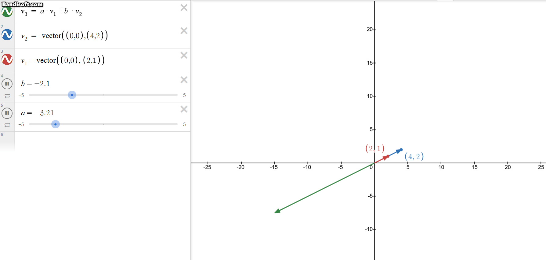 즉, 두 벡터는 서로 "스칼라 배수"관계 $(4,2) = 2(2,1)$ 이며, 이들의 선형 결합으로 만들어지는 벡터는 항상 같은 직선 위(원점을 지나는 직선)에 놓인다.