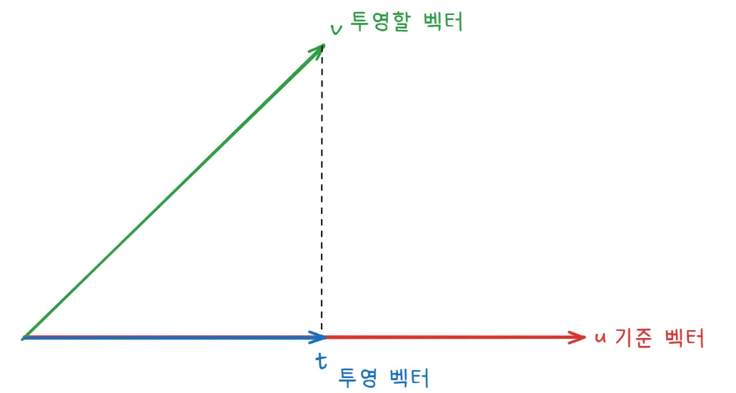 - 투영 벡터$(\vec t)$는 기준 벡터 $(\vec u)$와 “평행하지만”, 방향(부호)은 같을 수 있고 반대일 수 있다.