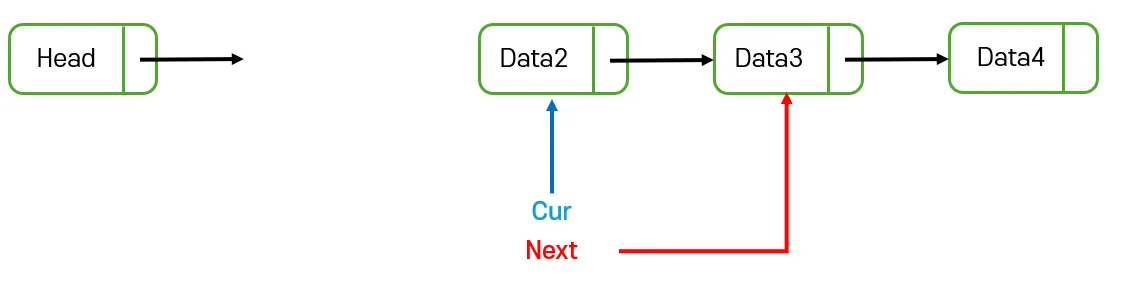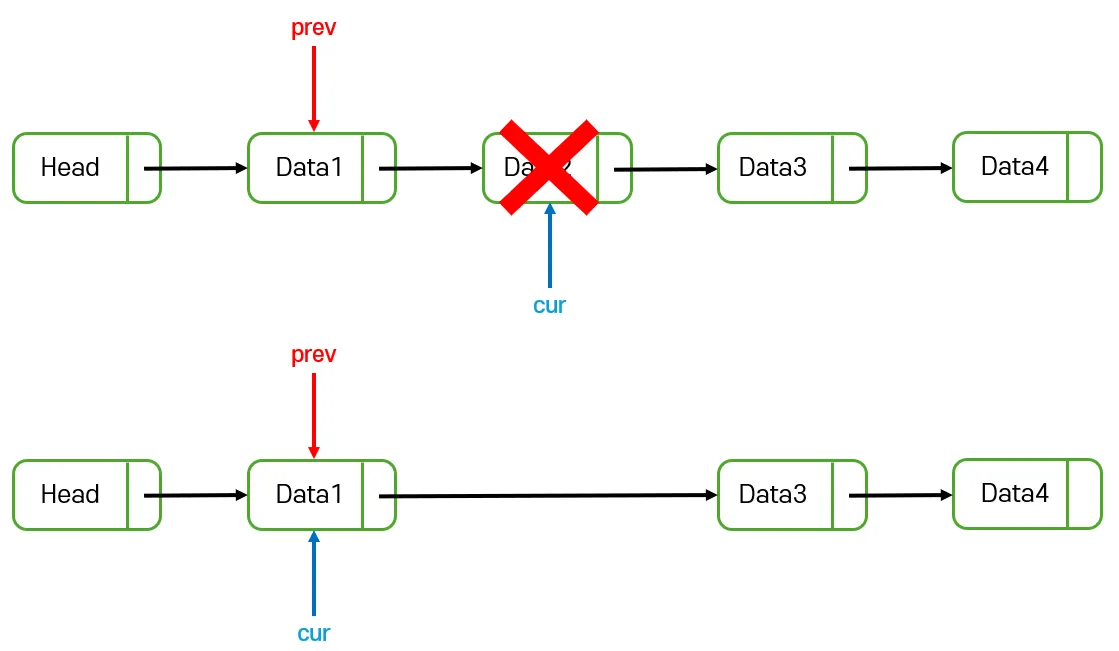 - 현재 노드(cur)의 next 포인터를 이전 노드(prev)의 next에 연결한다.