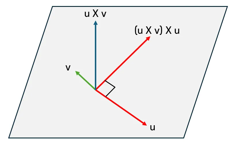2차원 평면의 벡터 $\vec u$와 동일한 평면에 위치한 임의의 벡터 $\vec v$가 주어졌을 때, 동일 평면에서 벡터 $\vec u$와 직교하는 벡터는 $(\vec u \times \vec v)\times \vec u$의 벡터 삼중곱을 사용해 구할 수 있다.