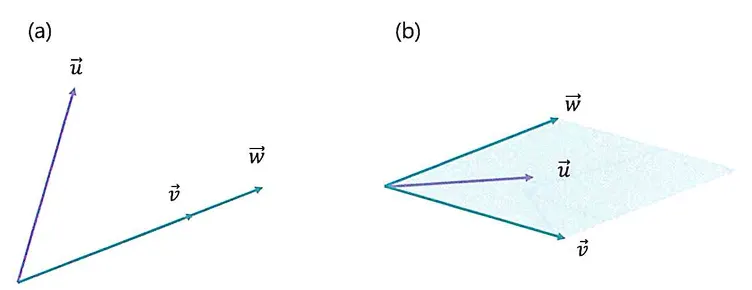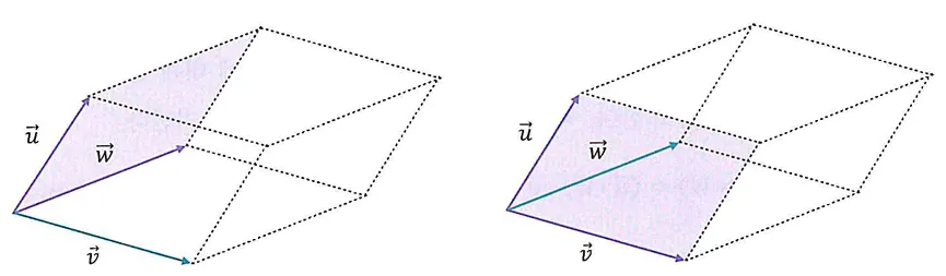 삼중곱의 값이 0이 나오는 경우는, 평면을 이루는 두 벡터$(\vec v, \vec w)$가 평행이거나, (b)와 같이 두 벡터가 만드는 평면에 벡터 $\vec u$가 속하는 경우이다.