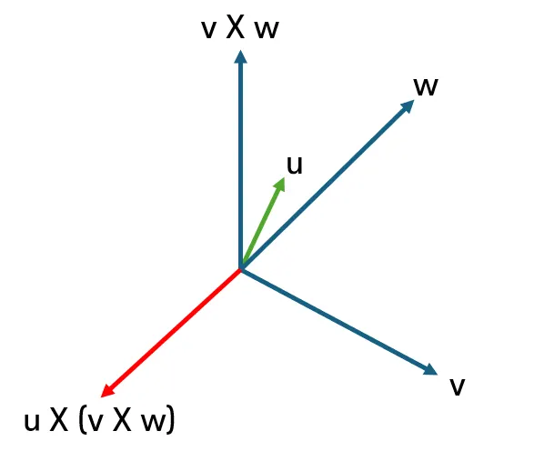 세 벡터의 외적으로 구성된 삼중곱 $\vec u \times (\vec v \times \vec w)$을 벡터 삼중곱(Vector triple product)이라 하는데, 벡터 삼중곱은 다음과 같은 성질을 지닌다.