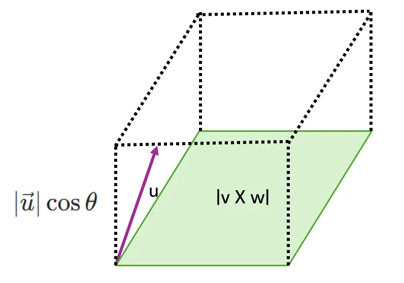 그렇다면 높이 $|\vec u| \cos\theta$에 평행사변형의 넓이 $|\vec v \times \vec w|$를 곱하면, 아래처럼 육면체의 부피가 나온다.
