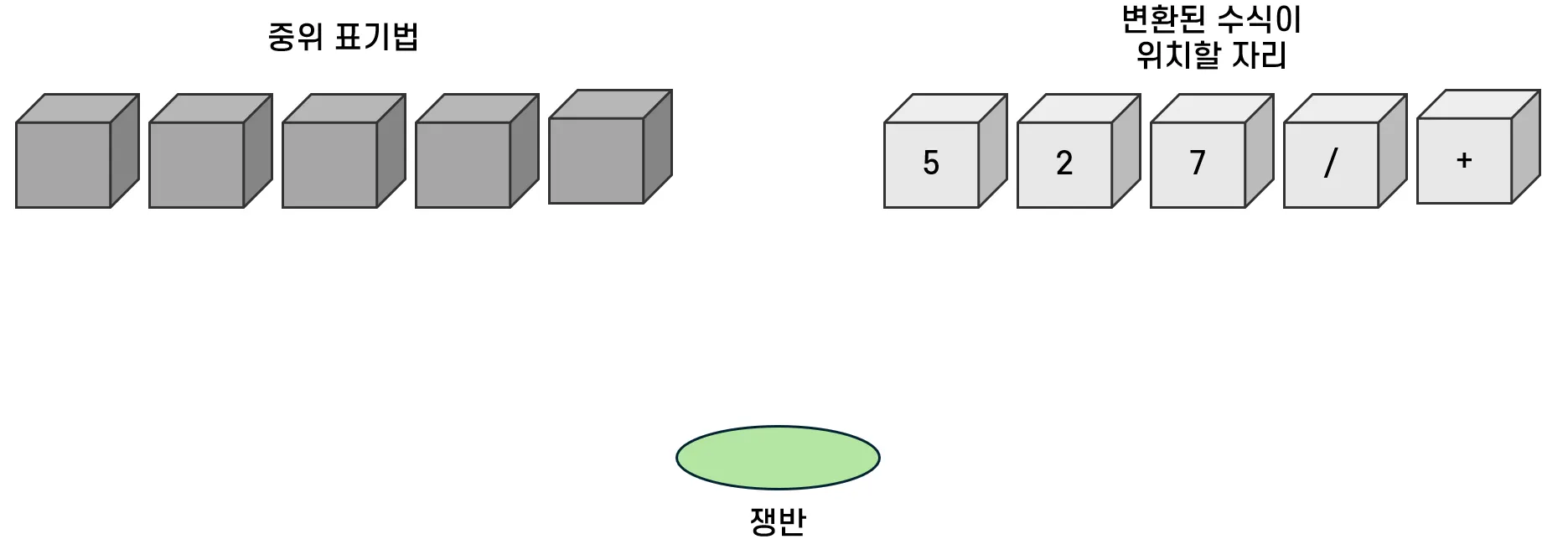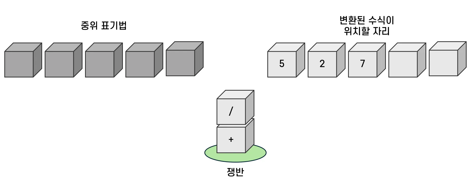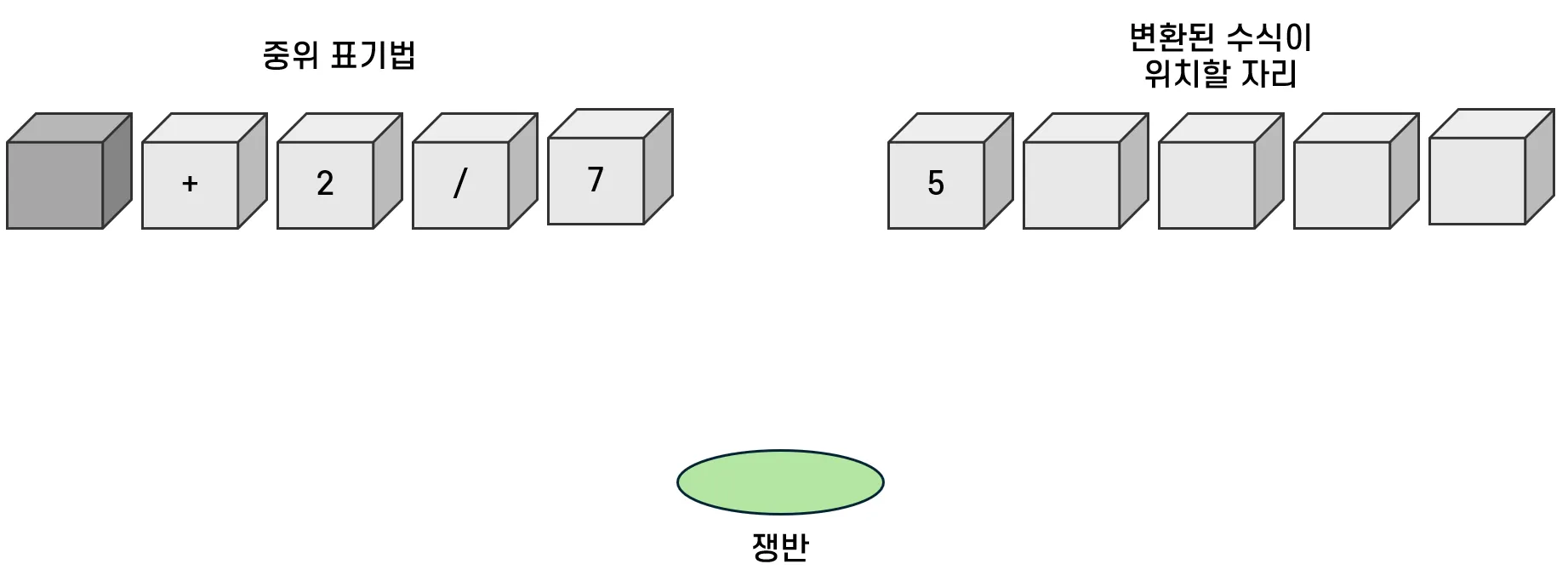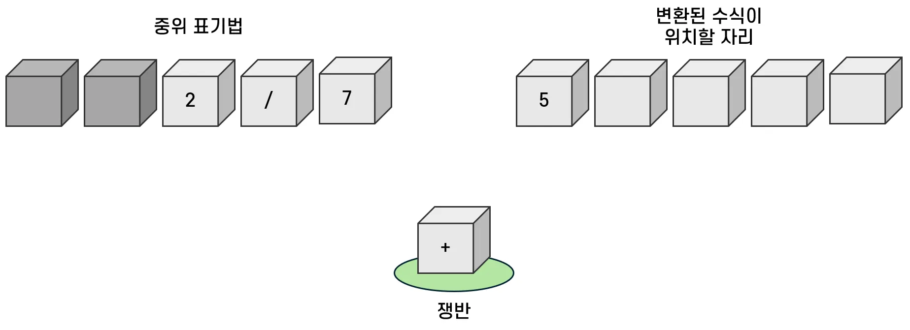 연산자가 등장하면 일단 쟁반으로 옮긴다. 다음 칸에는 피연산자가 있으므로 변환된 수식이 위치할 자리로 옮긴다.