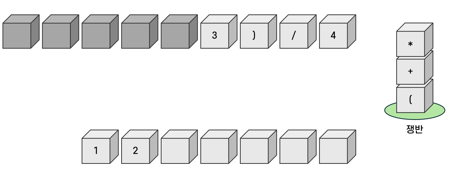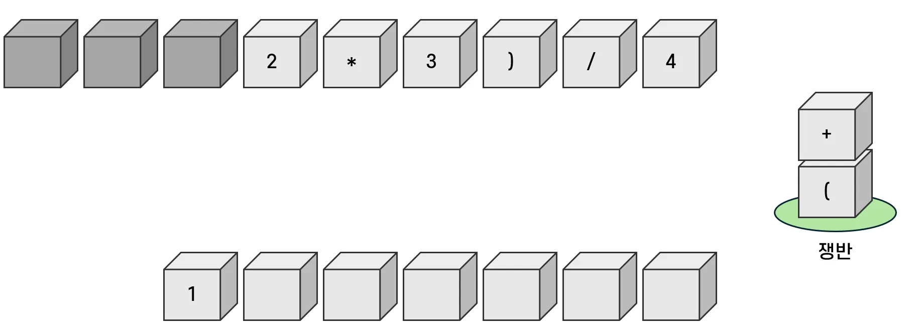 이 경우 쌓여있는 연산자를 모두 옮기고 난 뒤 연산자를 쟁반에 위치시킨다.