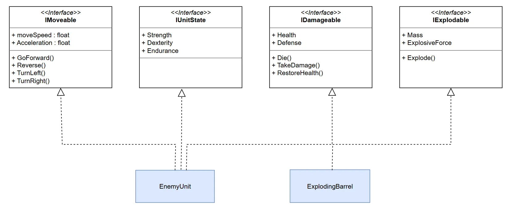 게임에서 유닛이 가지는 상태와 행동은 매우 다양하다. 하지만 이 모든 기능을 하나의 인터페이스에 몰아넣어버리면, 유닛마다 필요하지 않는 기능까지 억지로 구현해야 한다.