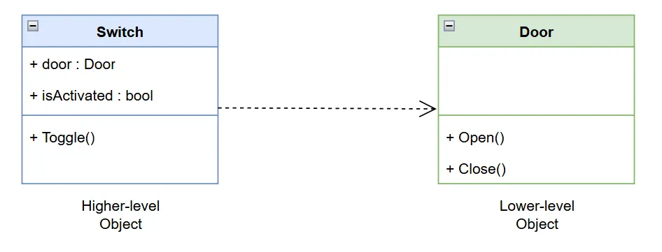 현재 구조에서는 Switch가 Door 클래스를 직접 참조하고 있으며, 스위치를 작동할 때 Door의 메서드를 그대로 호출하고 있다.