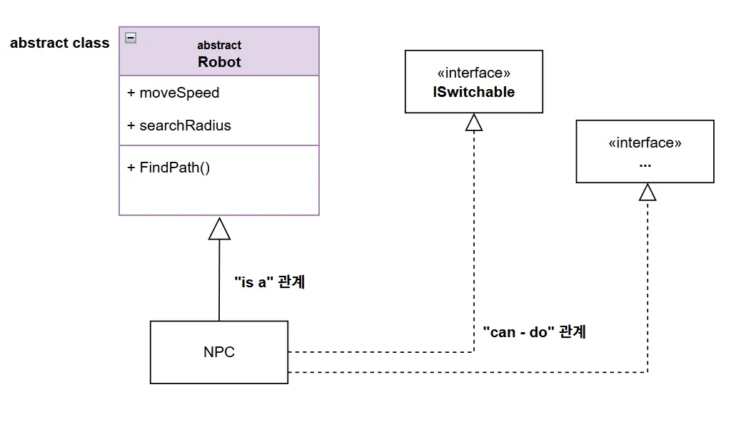따라서 C#에서 다중 상속을 구현하려면 Interface를 활용해야 한다. 인터페이스를 구현하게 되면 클래스와 인터페이스는 “can - do” 관계가 된다.