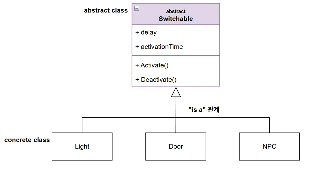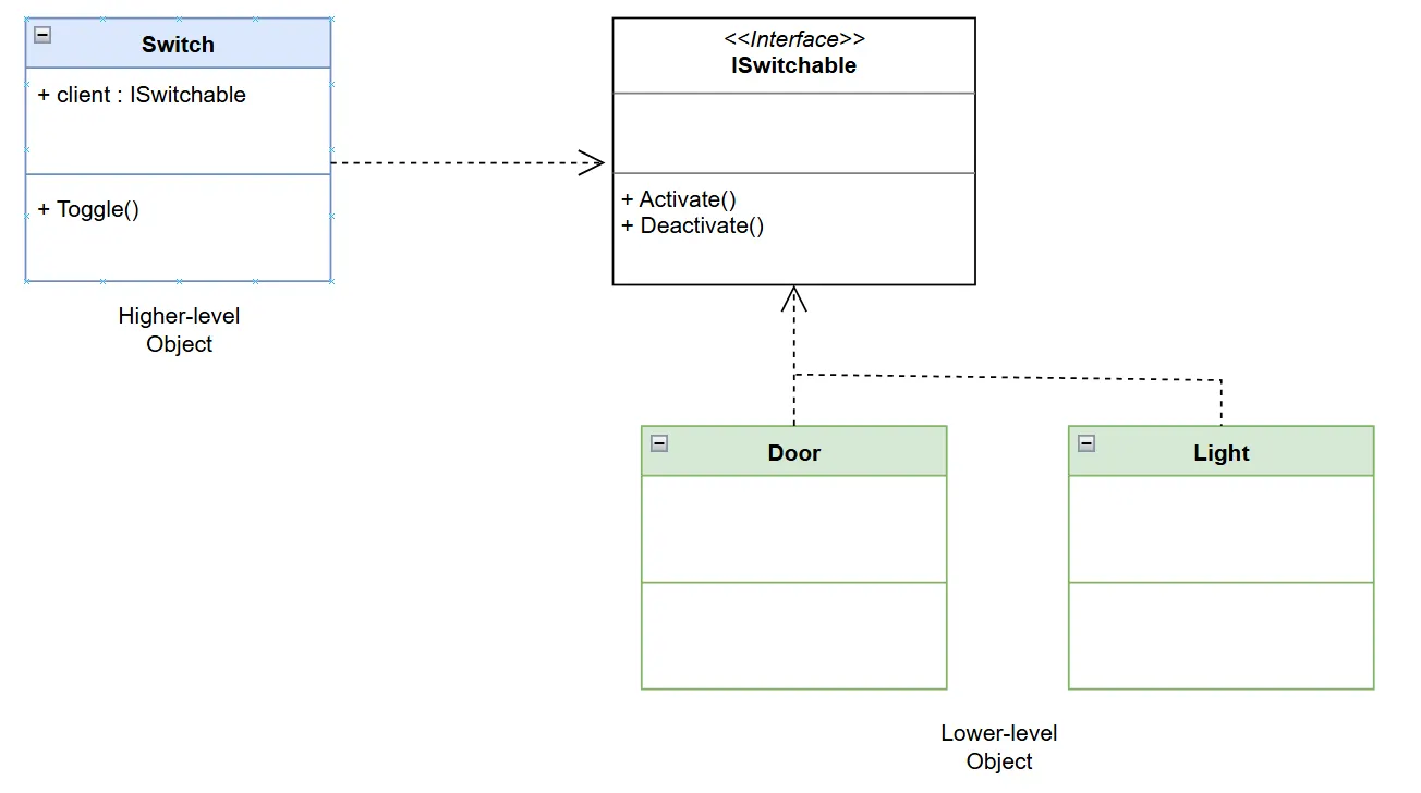 스위치가 가능한 오브젝트에서의 역할을 인터페이스로 따로 빼두고, 상위-하위 레벨 모두 이 인터페이스를 의존하게 만든다.