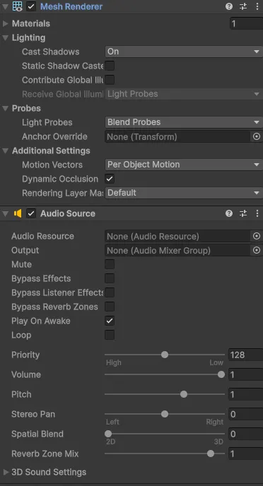 Unity의 컴포넌트를 보면 Audio Source는 오디오 출력을 담당하고, Mesh Renderer는 메쉬를 그리는 역할만 담당한다.
