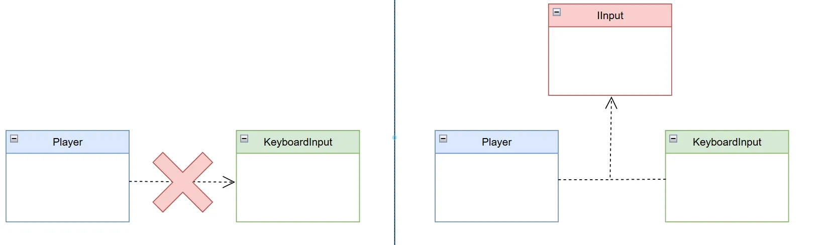 코드를 작성하다 보면 자연스럽게 상위 레벨(Player)이 하위 레벨(KeyboardInput)에 의존하게 되고, 이것이 일반적인 “정방향 의존”이다.