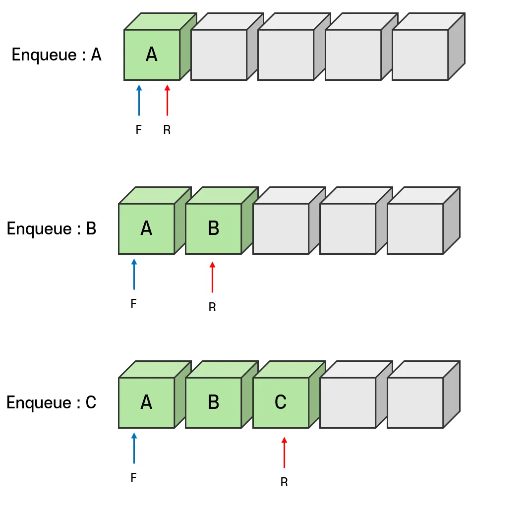 F(Fornt)가 가리키는 것이 큐의 머리이고, R(Rear)이 가리키는 것이 큐의 꼬리이다.
