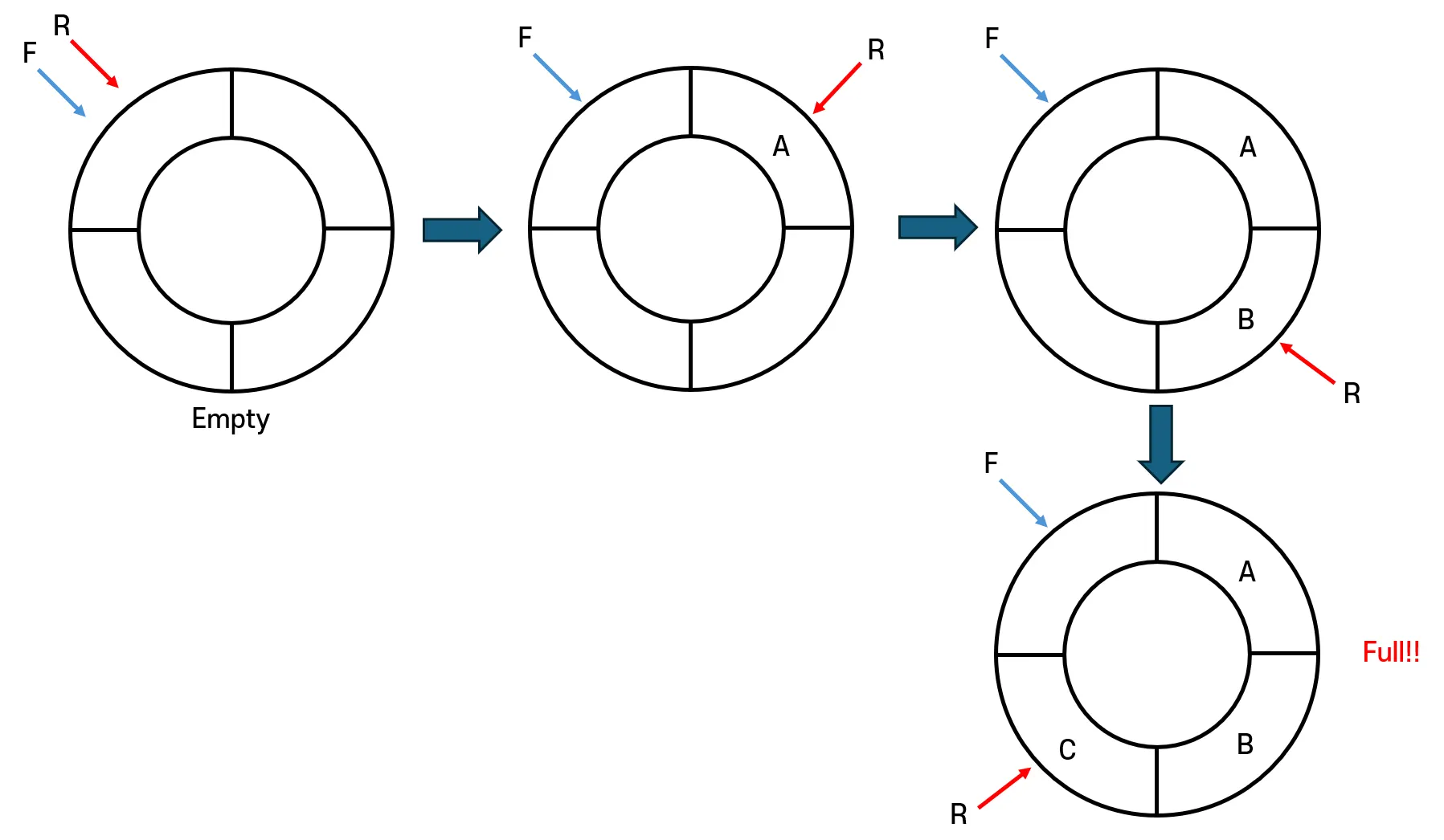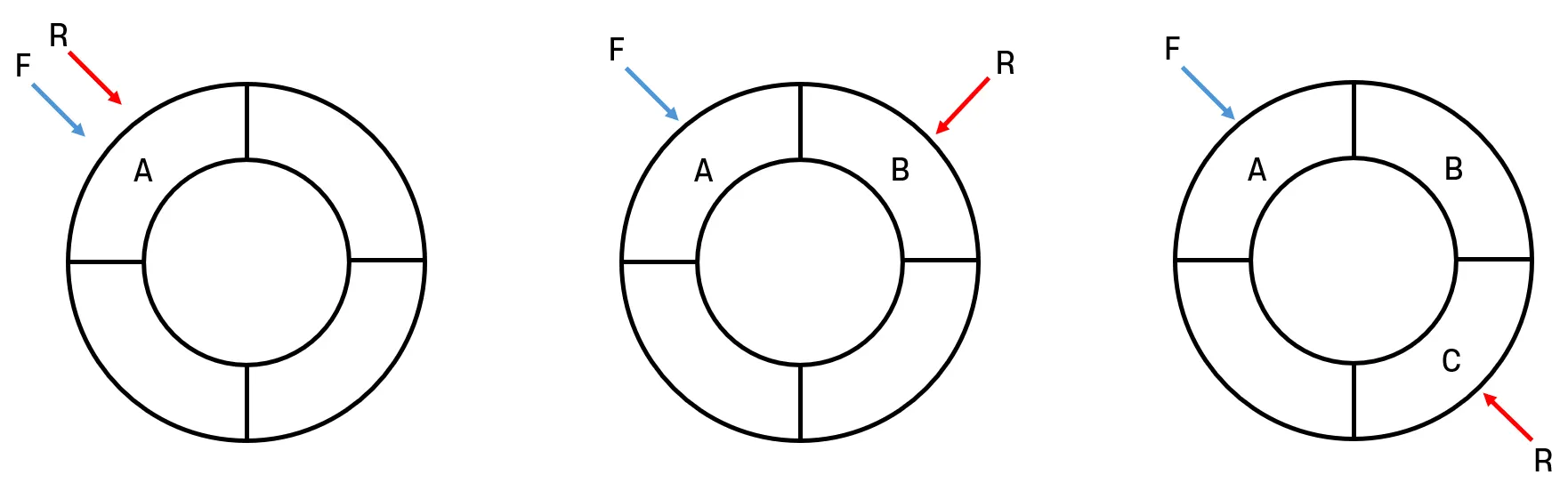 따라서 R과 F가 같은 위치를 가리킨다면 큐가 “비어있는 상태” R이 가리키는 앞 위치가 F라면 큐가 “꽉 찬 상태”로 해석할 수 있다.