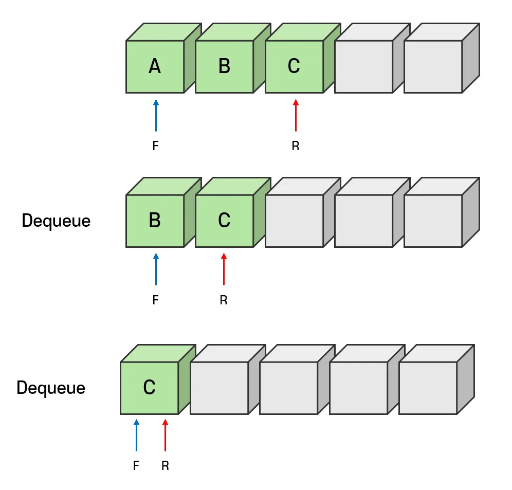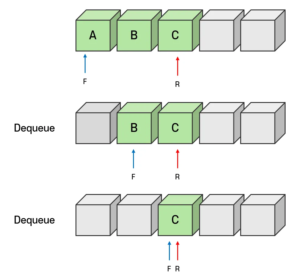 - Dequeue 연산 시 F가 가리키는 위치를 한 칸 이동시킨 다음에 데이터를 반환한다.