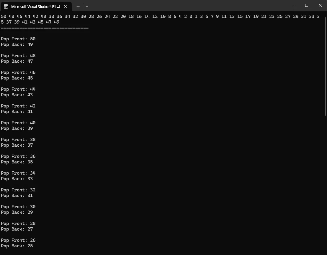 0~50까지의 수 중 짝수는 덱의 앞에, 홀수는 뒤의 덱에 추가한 뒤 앞 뒤에서 하나씩 pop 하면 성공적으로 덱을 구현한 것을 확인할 수 있다.
