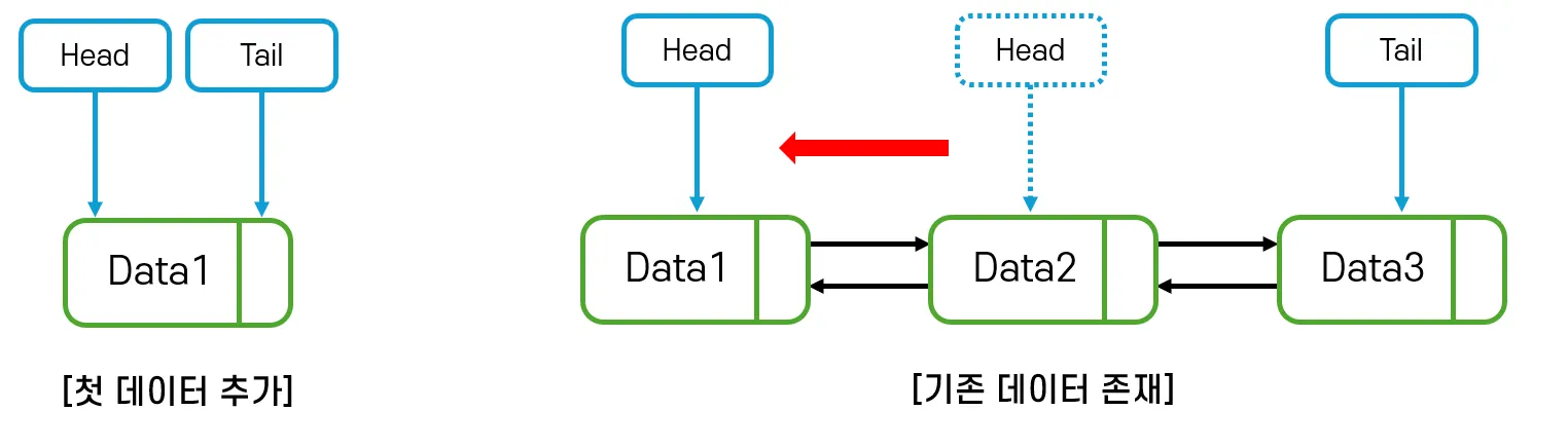 - 기존 데이터가 존재하는 경우라면, head가 가리키는 노드의 prev 포인터를 newNode를 가리키게 한 뒤, head노드를 옮긴다.