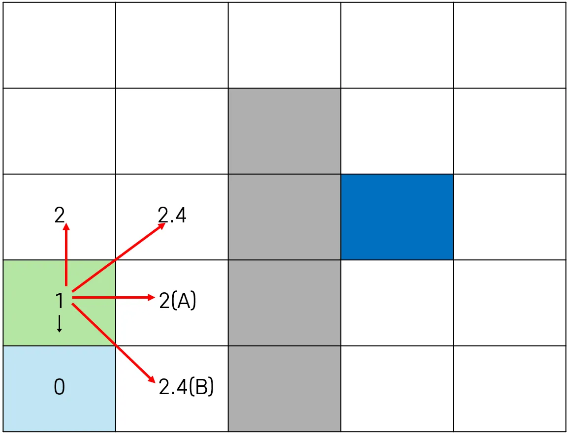 - 노드 A(1,1)는 Start노드로부터 탐색되었기 때문에, A노드에는 Start노드의 위치(2,1)를 기록한다.