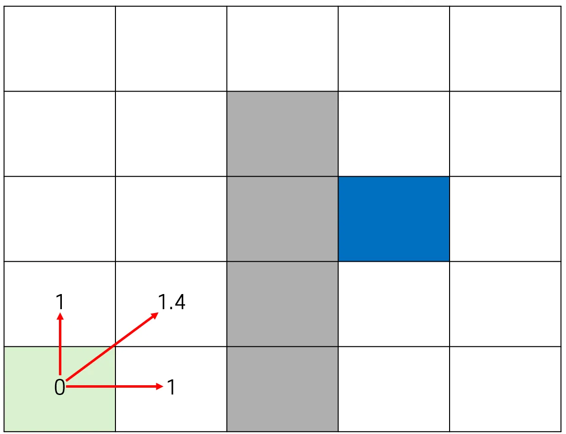 - cnt 값이 4 이상이면, 현재 탐색 중인 노드는 대각선 방향에 위치하므로, 기존 가중치에 1.4를 곱해 대각선 이동 비용을 반영한다.